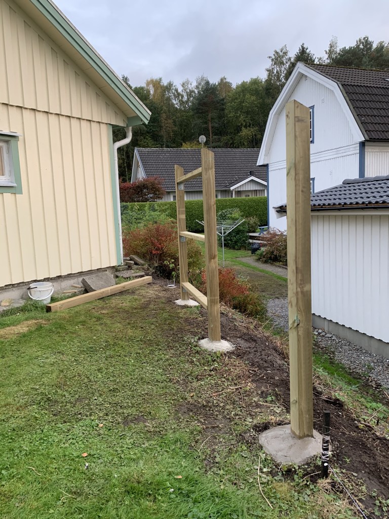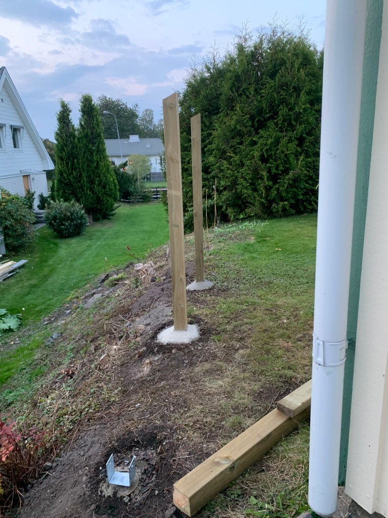 Det sista betongfundamentet för stolparna blev klart runt den 10 november. Jag får erkänna att det blev ett antal ordentligt kyliga och sena arbetskvällar, och mössan med inbyggd pannlampa fick användas flitigt för att kunna se var man satte både skruvar och brädor.