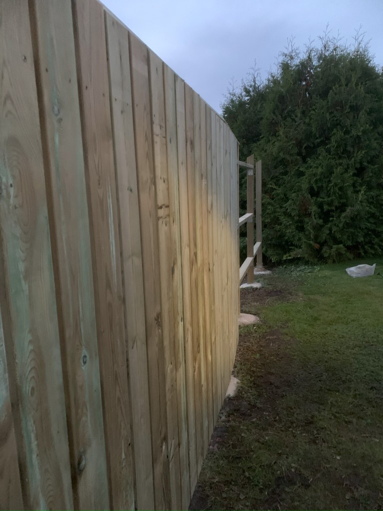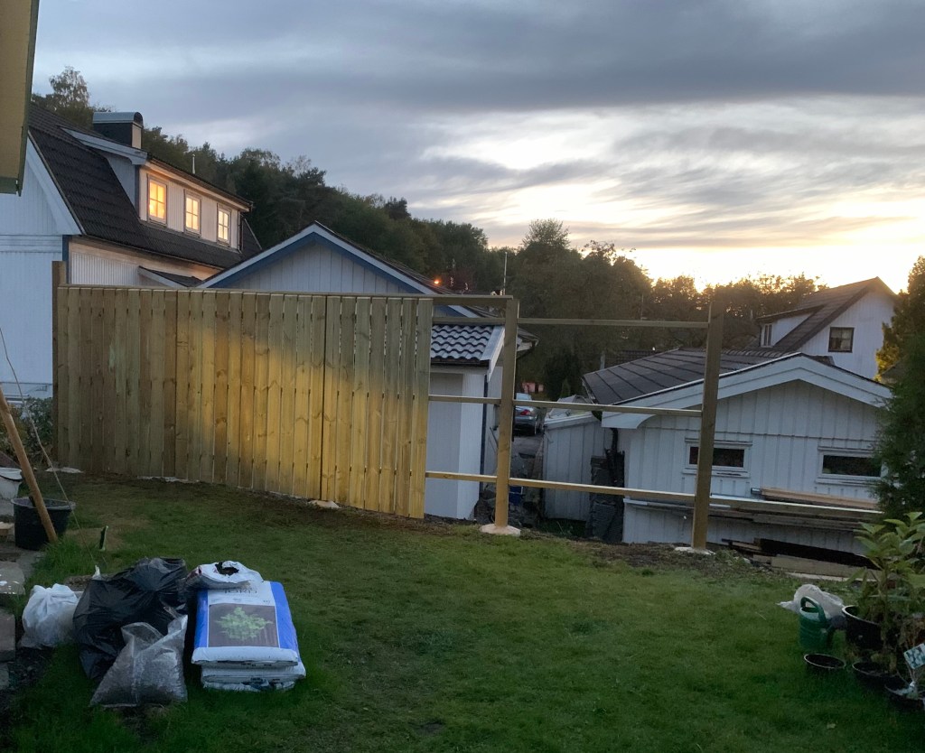 En spännande insikt var vilken stor skillnad svagt lutande mark kan ha, även på en ganska kort sträcka. För ögats skull vill man ju gärna bygga och skapa en rak horisontallinje. Bredvid garaget, där vi började sätta planket är det 185 cm högt – och på den nedre avslutande sidan blev det till slut 245 cm högt. Det gick med andra ord åt ganska mycket mer virke på den sista delen än beräknat.