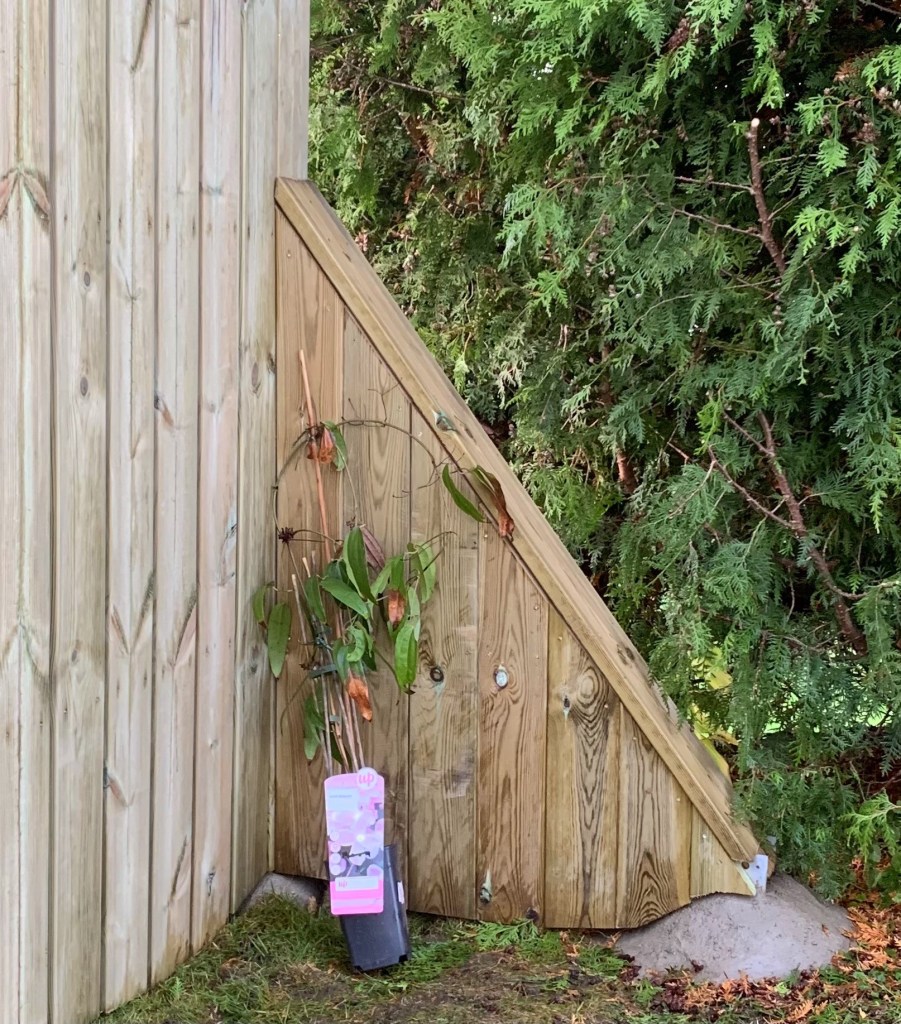 Efter att googlat och fått inspiration började vi rita, skissa och räkna på materialåtgång. Visionen vi kom fram till, var att få ett ca 180 cm högt plank som med tiden bleknar och lyser vackert silvergrått i eftermiddagssolen. Det började byggas i anslutning till garaget. En dörr planerades att sättas mellan garage och plank. Tanken är att man lätt kan ta sig runt hörnet till drivbänkar och planteringsbord med fina praktiska zinkskivor. (Den platsen blir ett annat projekt att berätta om, längre fram.)
