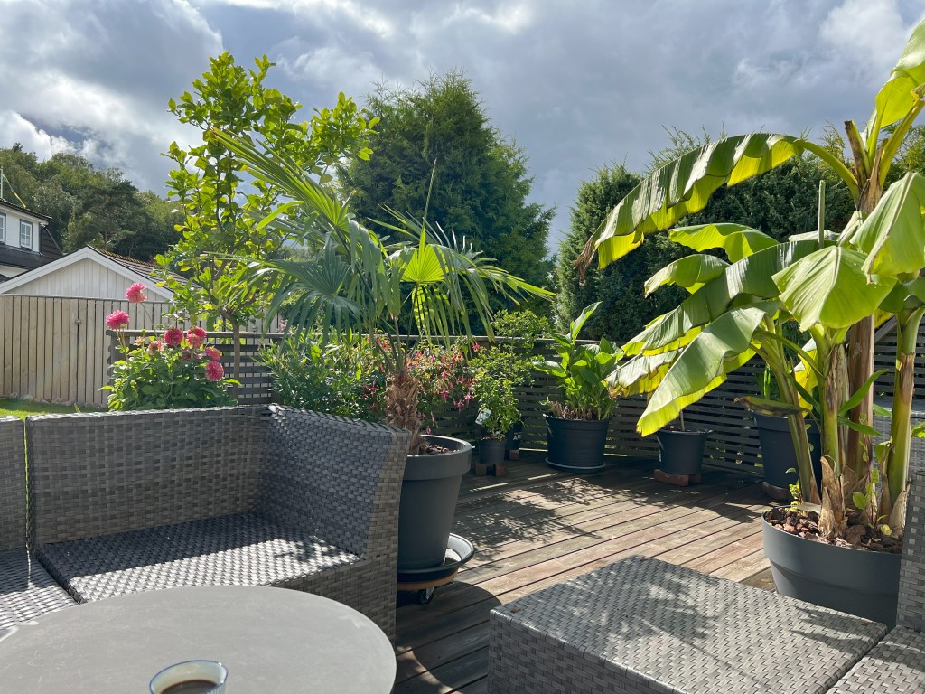 Vi var alldeles nyinflyttade, och det var i mitten av mars månad. Snart upptäckte vi vilken helt fantastisk altan vi har. Så fort vårens lite starkare solstrålar lyckas kämpa sig över skogens lägsta trädtoppar, landar de här nere hos oss och värmer härligt. Det är en perfekt plats för att bara vara, njuta, äta, umgås och att odla.