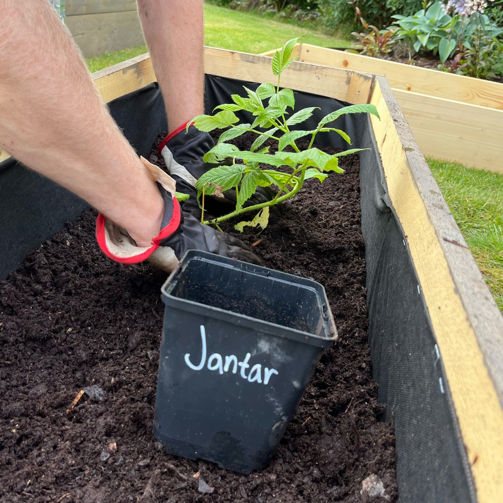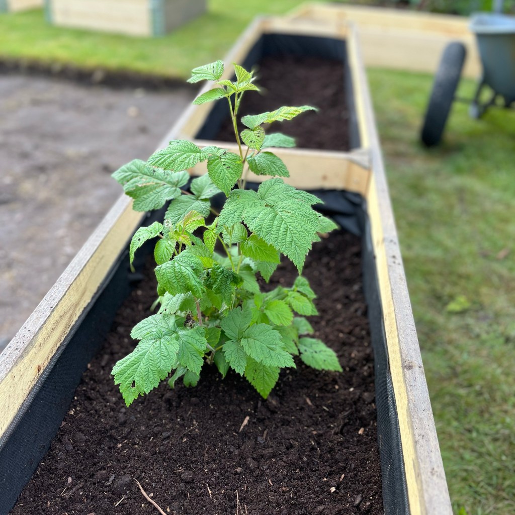 Ni kanske minns hallonlådan från förra inlägget om köksträdgården. Vi fyllde den med blåbärsjord och kogödsel – en riktigt bra kombination! Våra första plantor fick äntligen sin plats i trädgården.
