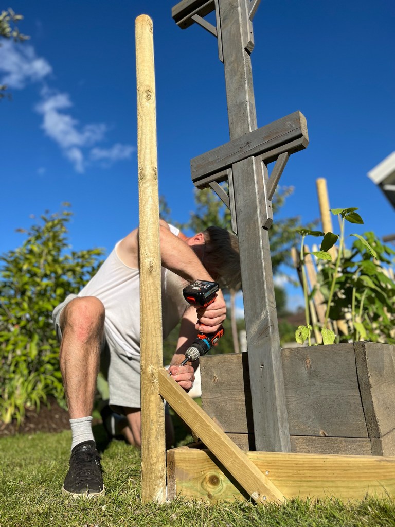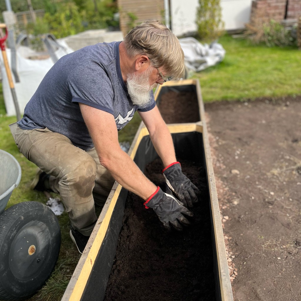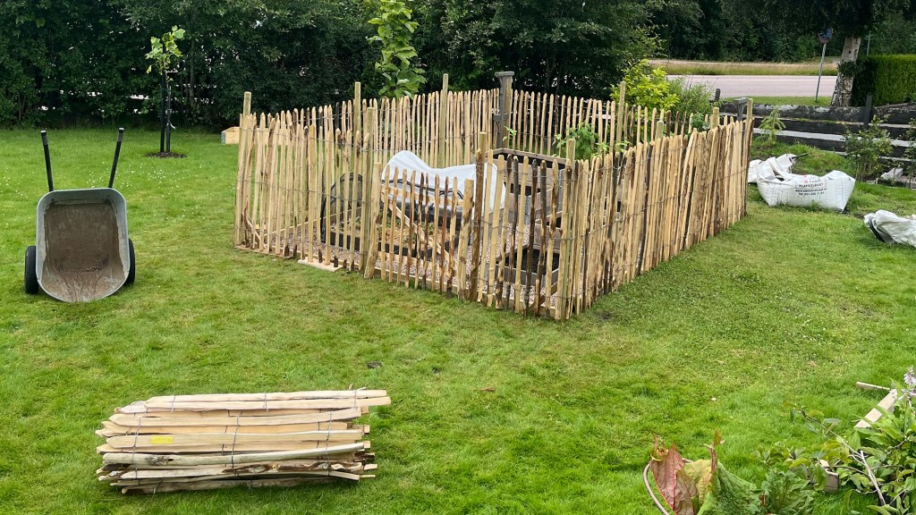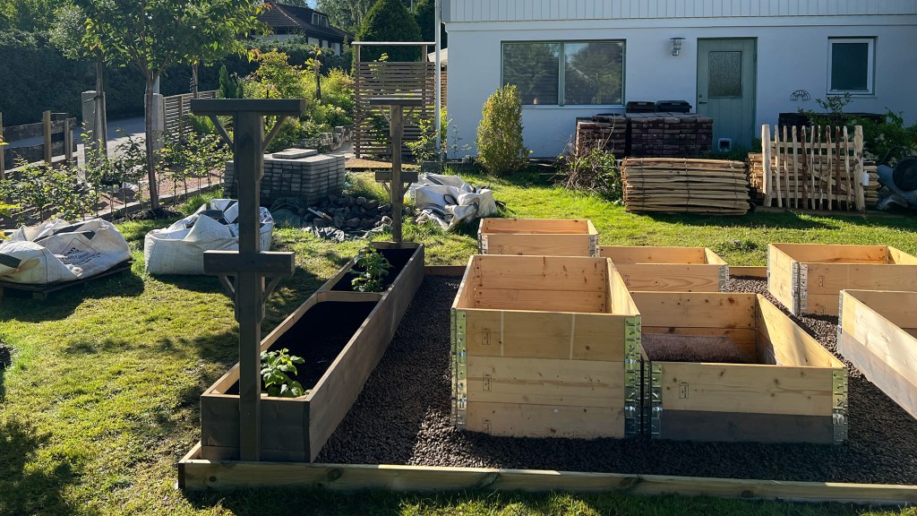 - Det är bra om du fyller upp pallkragarna med jord och gödsel innan staketet monteras. Det blir enklare att hantera alla lass och säckar då.