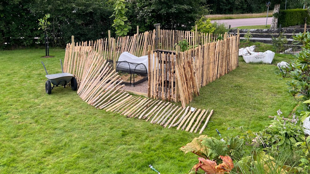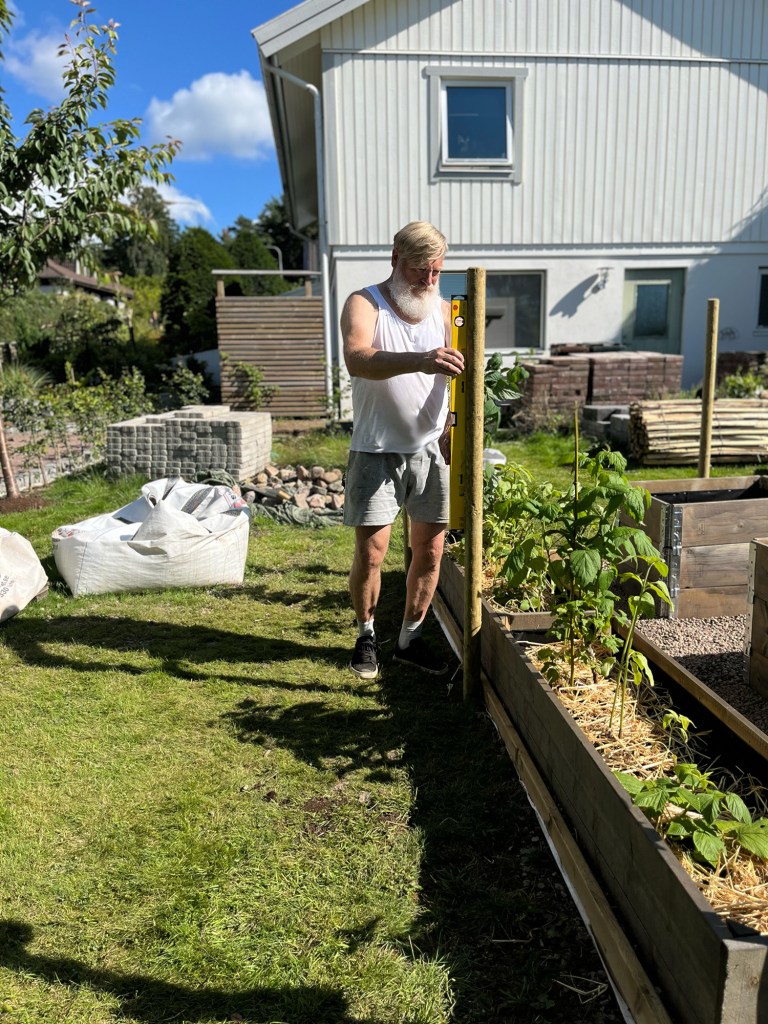 Stolparna är av tryckimpregnerat virke som vi slog ner i marken med spett och slägga. Och det är inte dumt att använda vattenpass för att få dem raka i både djupled och sidled. Hörnstolparna fick extra stöd och monterades fast i ramen. Sen var det ”bara att rulla på” staketet. Eller njae, en hel del råstyrka krävdes. Tur att vi var tre – jag, Håkan och vår starke son. En som håller upp och drar, en som använder kofot för att spjärna staketribban mot stolpen och en som skruvar fast staketet en stolpe åt gången.