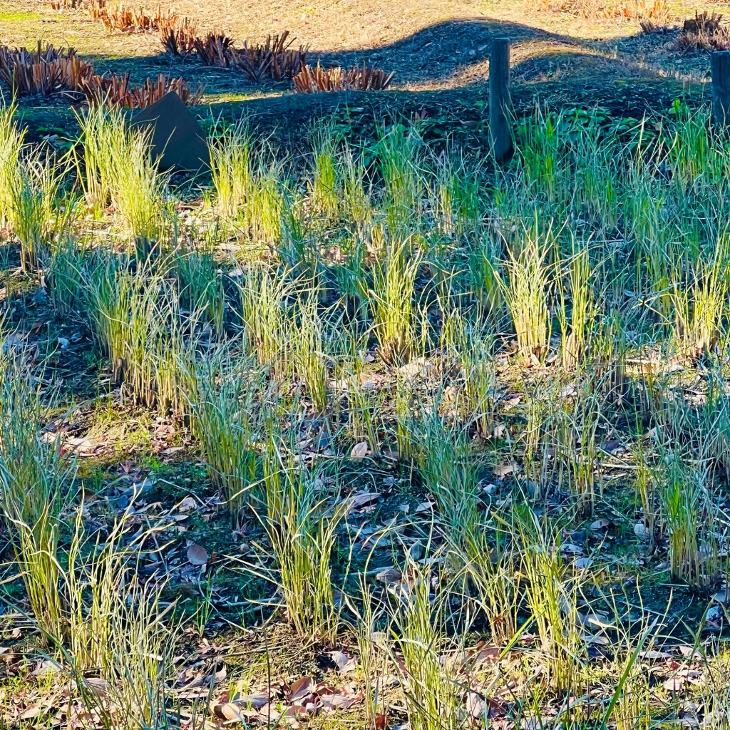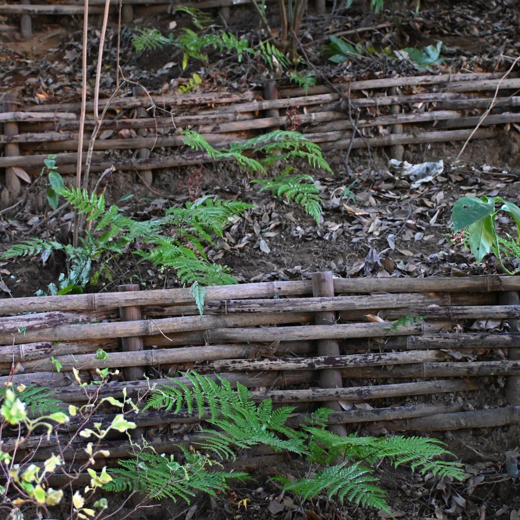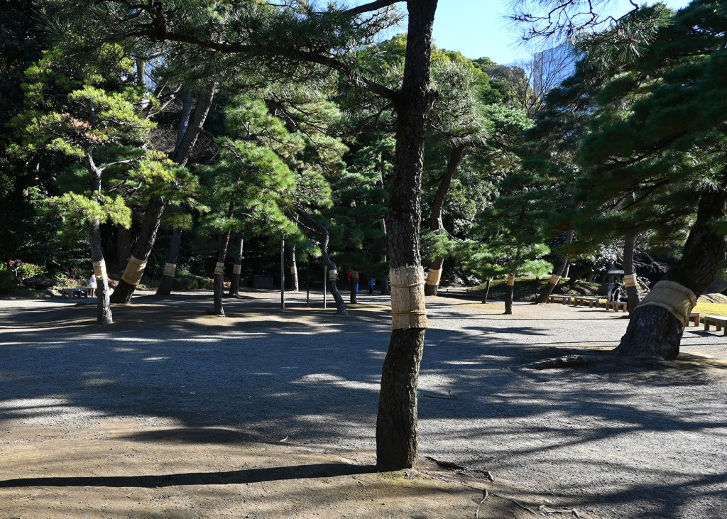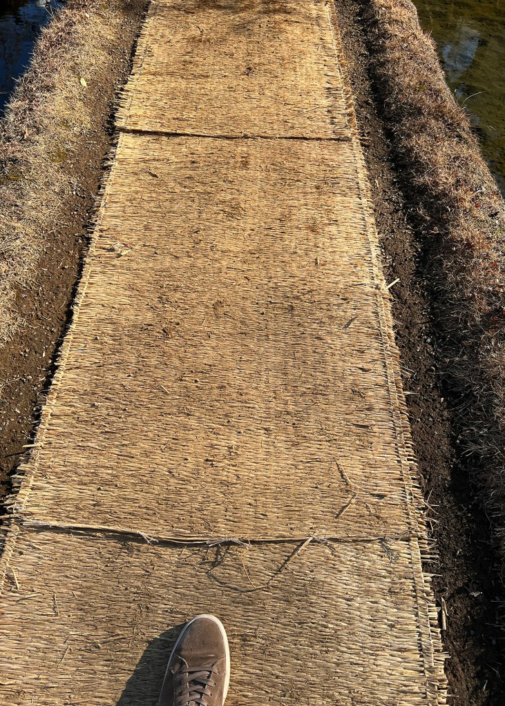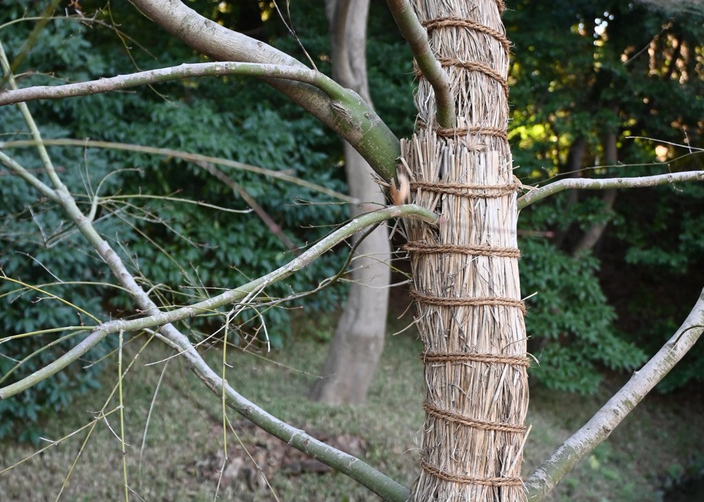 Vi lade också märke till något annat som väckte vår nyfikenhet. På många träd var delar av stammarna inlindade i halmmattor, men bara till en viss del. Det verkade inte handla om att skydda barken mot kyla eller slitage. Hemma är vi vana vid problem med rådjur som fejar hornen mot unga träd, men det verkade inte vara fallet här. Kanske var det någon form av jul- eller nyårsdekoration, tänkte vi först?!