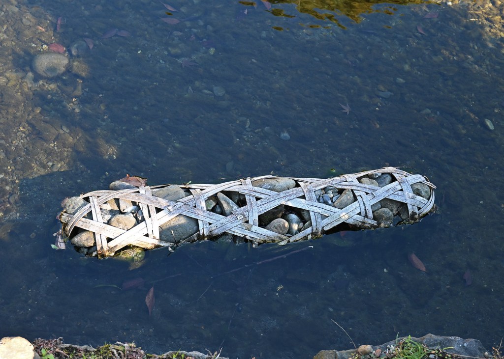 Jakago är traditionella japanska korgar, ofta gjorda av flätad bambu, som fylls med stenar för att förstärka flodbankar, förhindra erosion och skapa estetiska landskap i japanska trädgårdar.