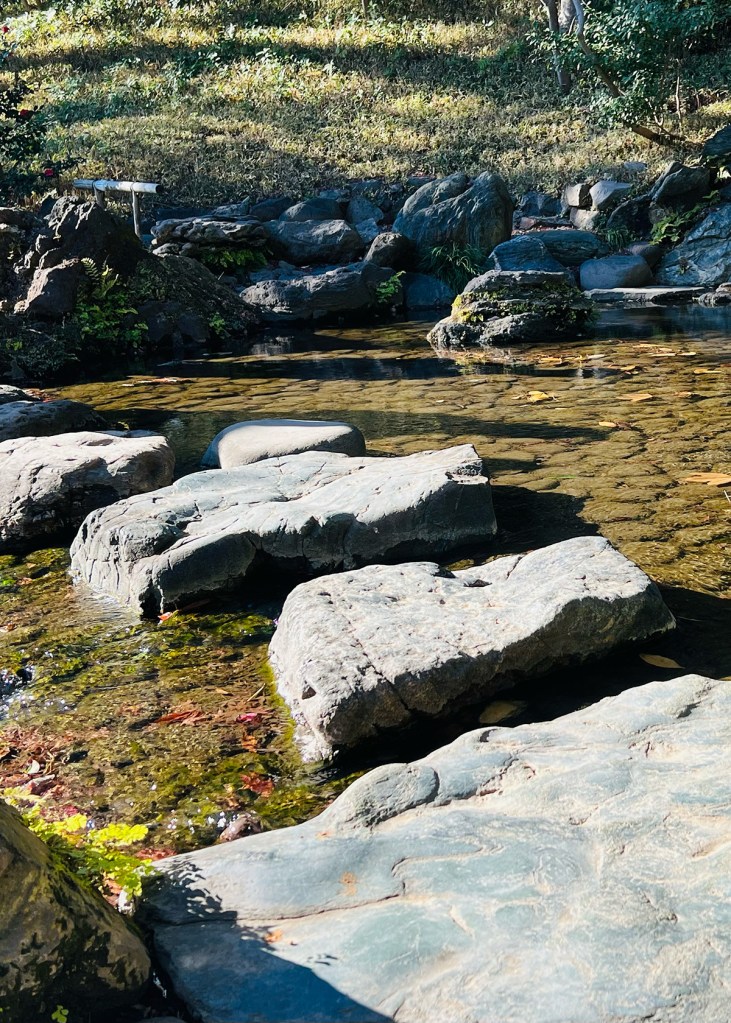 Det är ett levande element som tillför rörelse, reflektioner, ljud och skuggspel, samtidigt som det gynnar den biologiska mångfalden. I japanska trädgårdar möts du ofta av dammar som övergår i slingrande bäckar, porlande vattenspel eller små vattenfall. Vattnets väg leder blicken vidare och lockar dig till att följa stigen, där nya vyer och oväntade detaljer långsamt avslöjas. Stigar, spångar, stenbroar och vackra trampstenar gör att vattnet ständigt finns nära. I de stilla, mörka dammarna rör sig stora karpar lugnt genom det klara vattnet, som om dammen formats kring dem snarare än tvärtom.