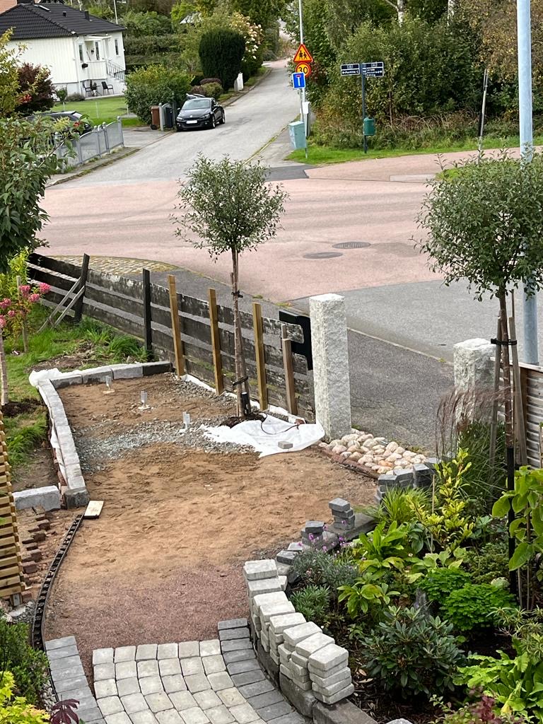 Runt anläggningen kommer vi att plantera en avenbokshäck som bildar en fin grön vägg, döljer tunnorna och skapar insynsskydd ytterligare från gatan.