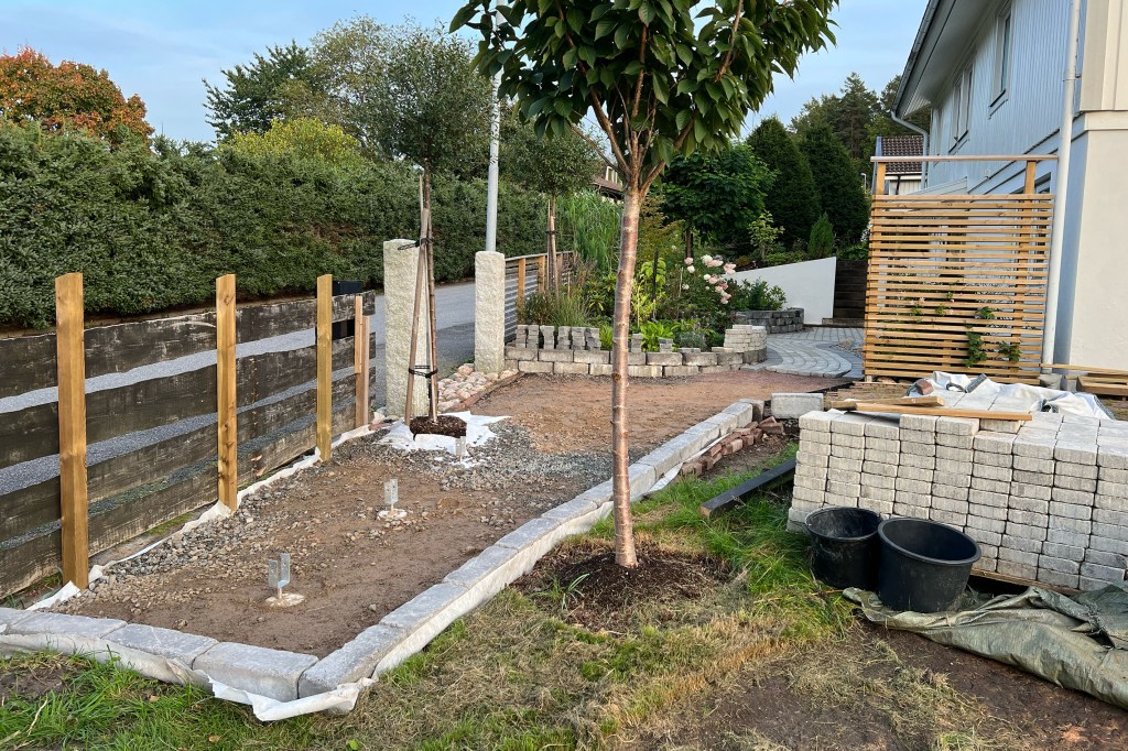 Det kommer att krävas en hel del arbete med stenläggning och natursten för att få till kantmurar, samt hålla samman rabatterna och få till en stig. Tanken är att stigen kommer att leda ner till en damm i böljande form. Men det är väl en av de minst utvecklade planerna i vår projektplanering ännu.