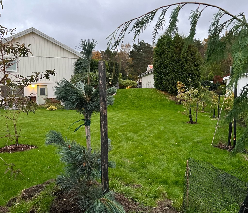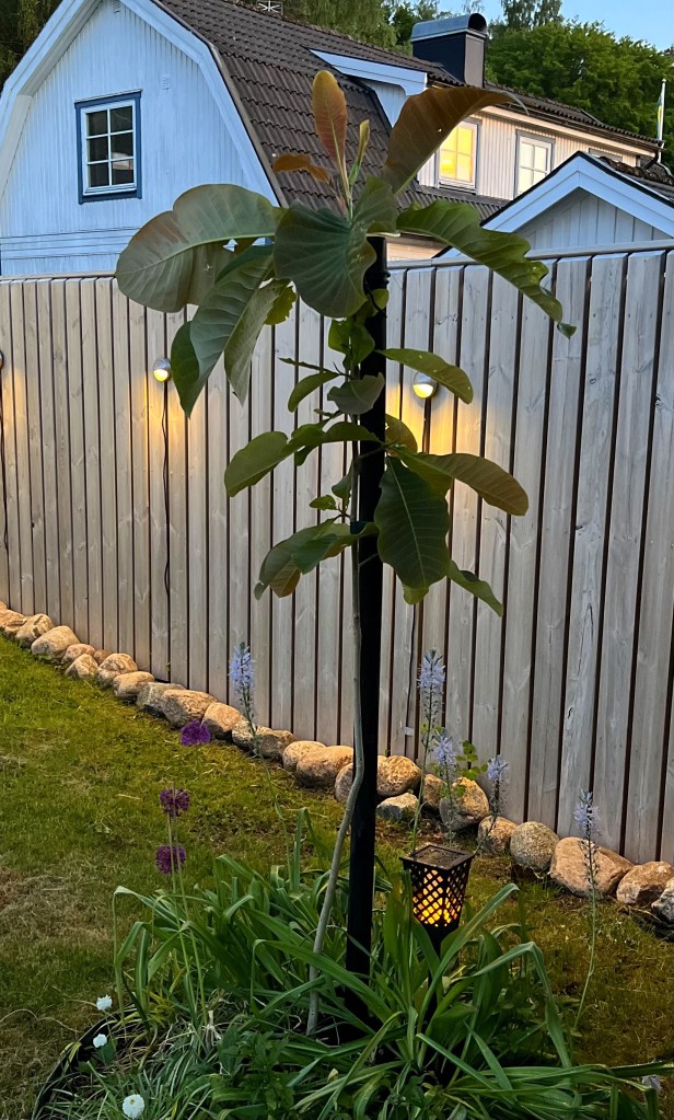 Sen har vi tjuvstartat rabatten som ligger mitt emot bambulunden. I den har vi planterat ett trumpetträd som Håkan drivit upp från ett sticklingskott. Och under trädet har vi höstfyndat perenner och buskar i olika färg och struktur.