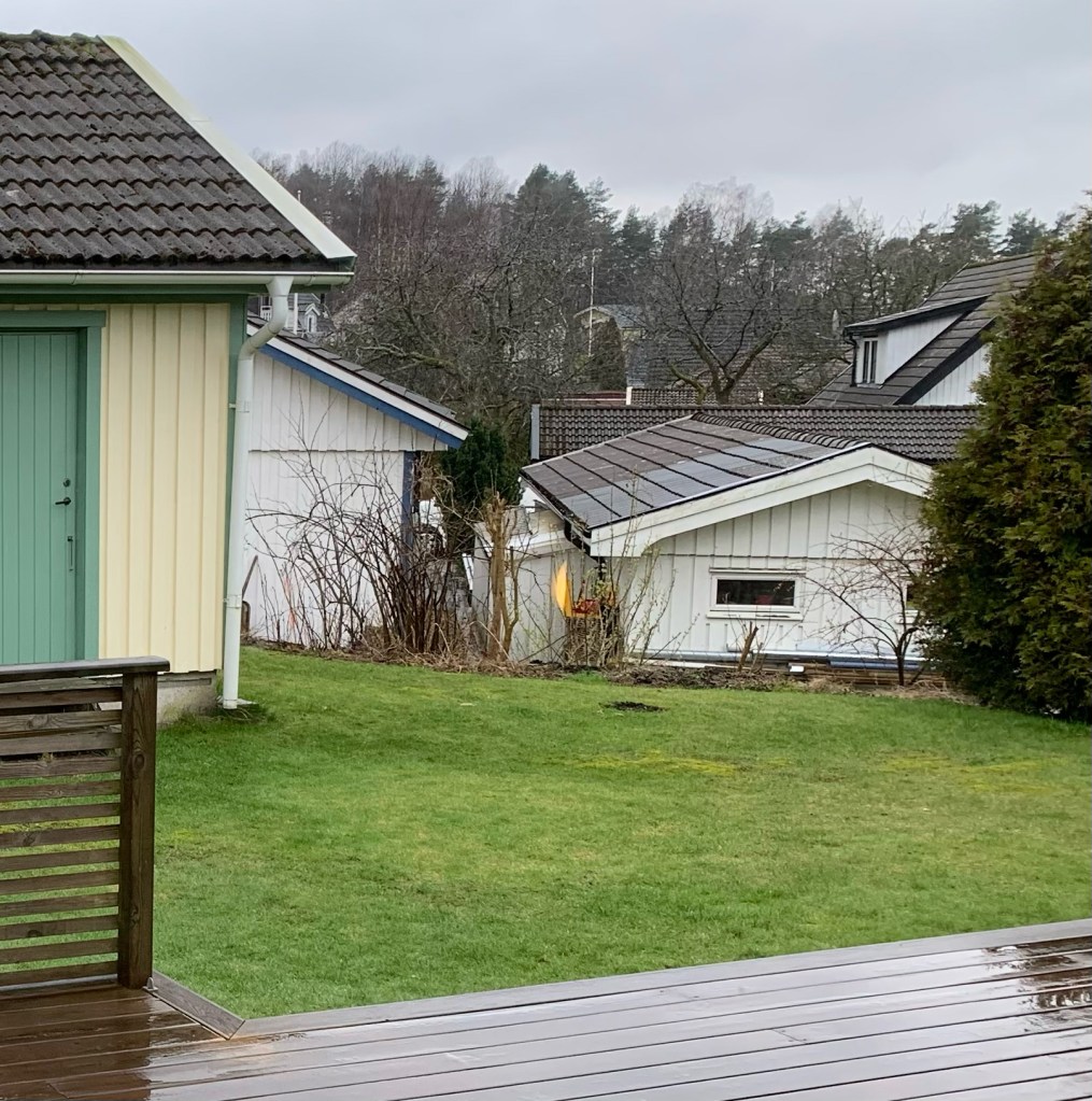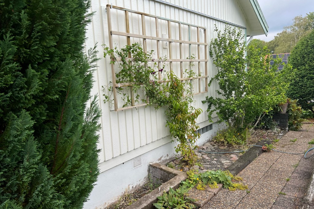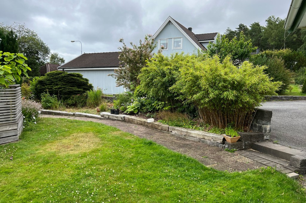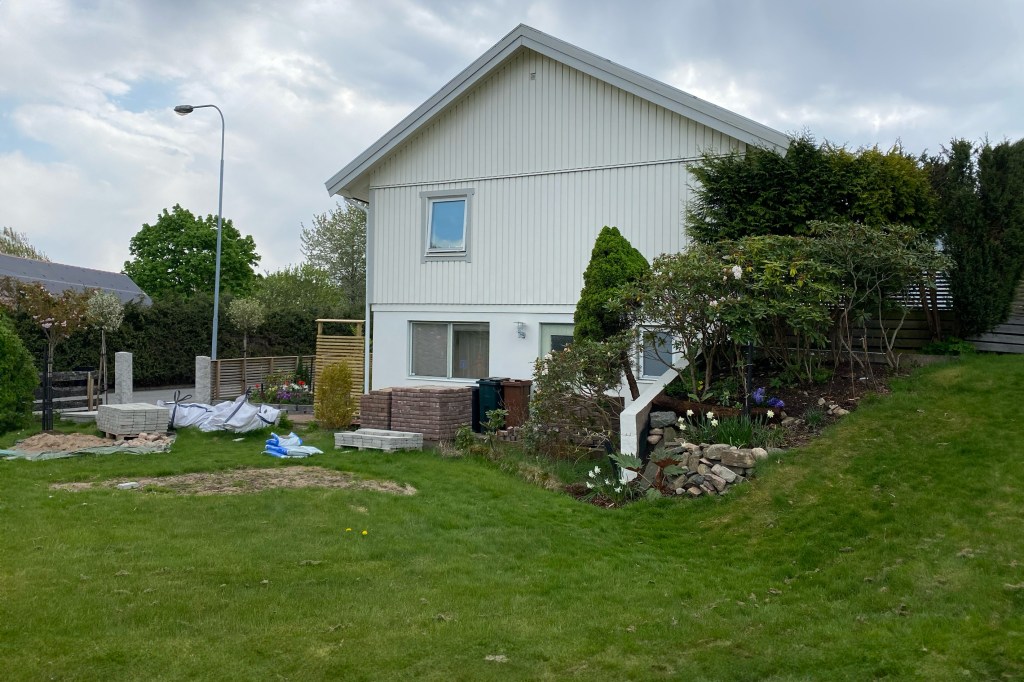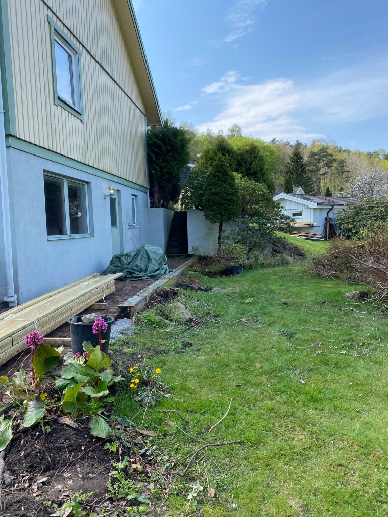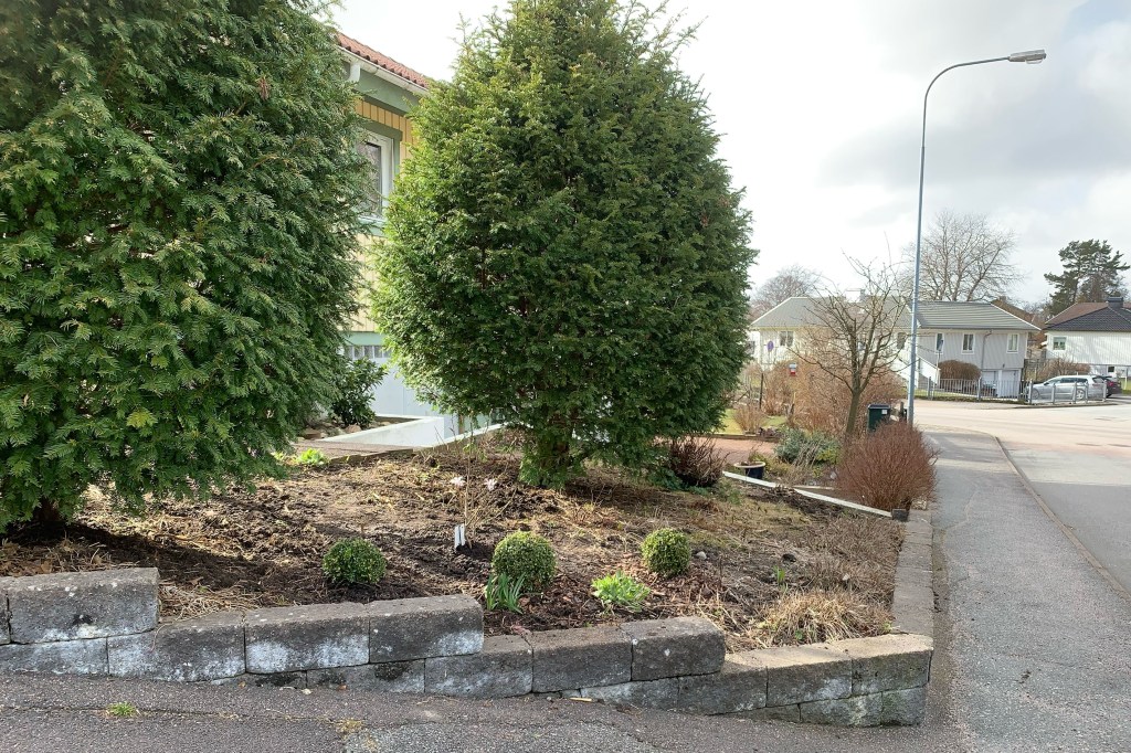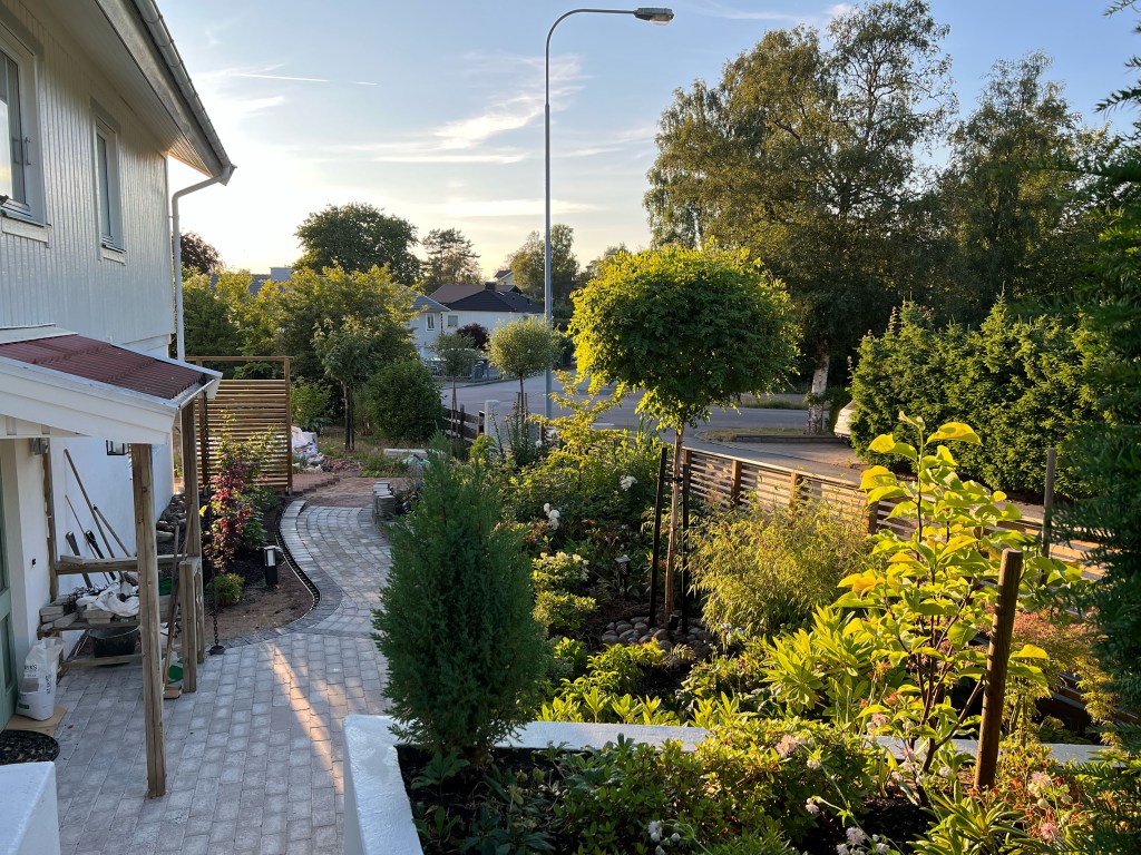 Huset är byggt på 90-talet. Material- och växtval är tidstypiska för perioden. Det finns mycket av huset exteriört, planteringar och markarbete som vi vill göra om. En del växter har vuxit sig alldeles för stora, vissa har anlagts och planterats på fel plats (alltså saknar rätt förutsättningar för att trivas) samt vissa tycker vi helt enkelt inte om. Även om de tidigare ägarna tyckte om trädgård så är ju smaken olika. Så klart kommer vi behålla en hel del också.