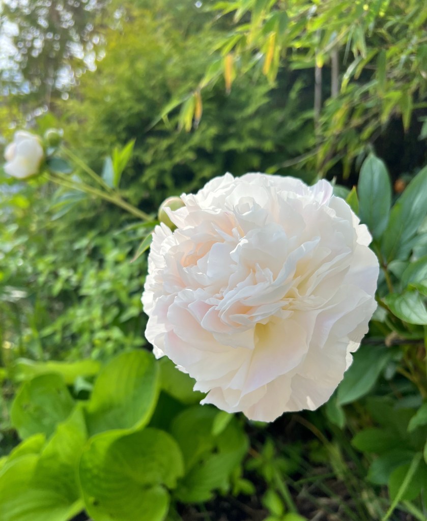 Många vackra pioner kommer fram på försommaren och de trivs bra tillsammans med stjärnflocka och daggkåpa. Än så länge har vi bara en källa till vatten och den finns här i form av en rund vattenspegel så att fåglarna kan ta sig ett bad.