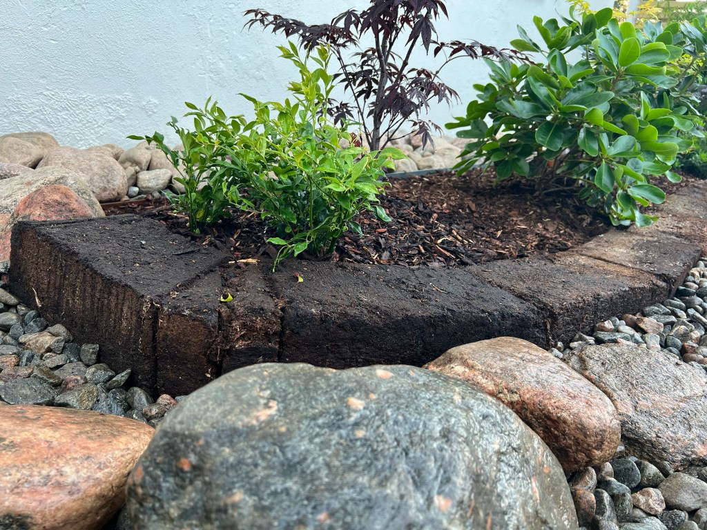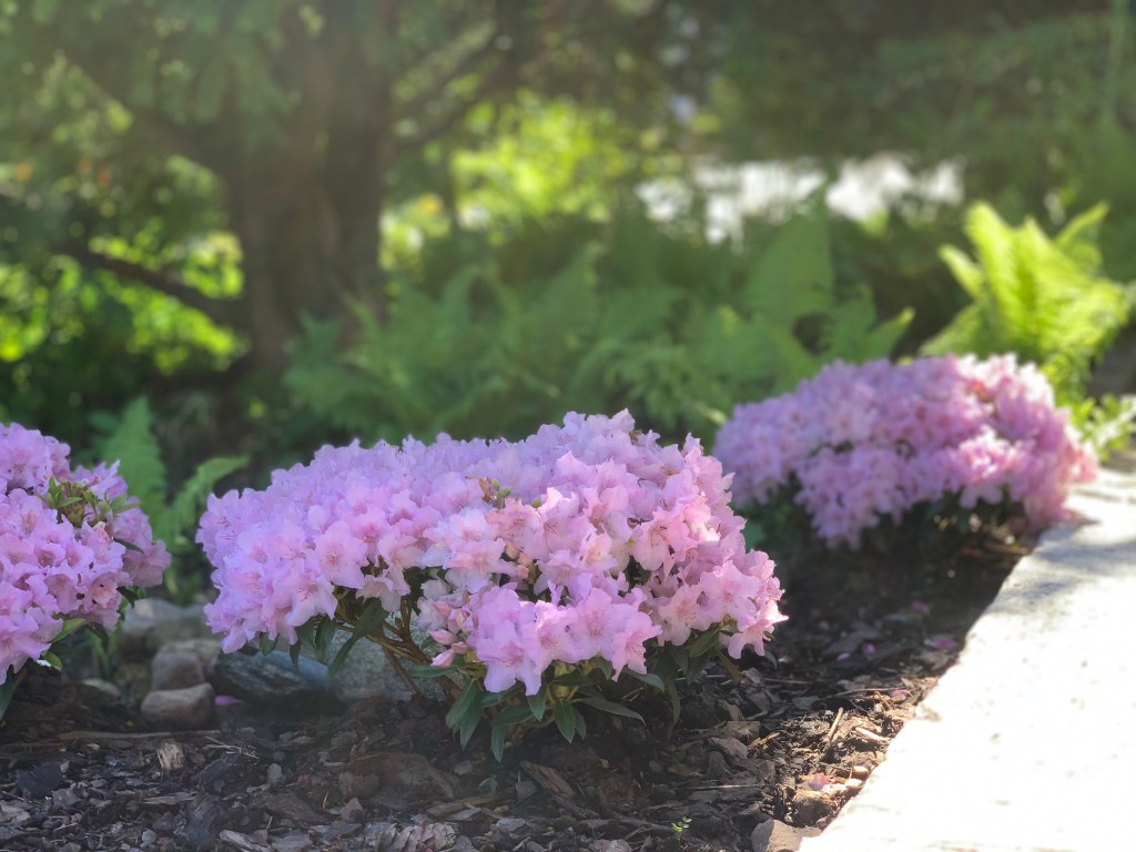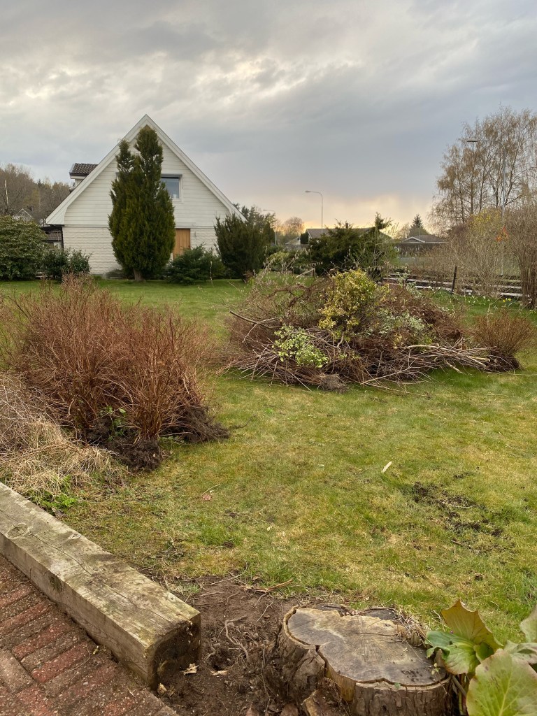 2021 startade vi arbetet med att gräva, såga ner träd och flytta buskar i rabatten framför huset. Det var ett omfattande arbete där vi ändrade förutsättningarna på jorden. Vi fyllde på med blåbärsjord, surjord för växter som är bättre anpassade för läget med mycket skugga och bara sol på förmiddagen.