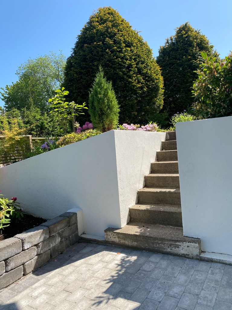När barnen var mindre var detta den perfekta pulkabacken, en liten kort pist ner ut på en plan gräsmatta. När vi behöver klippa gräset är det hemskans brant att gå uppför. Våra planer för backen eller Backstigen som vi kallar den, är att terrassera och skapa en serpentinstig med buskar, prydnadsträd och perennrabatter.