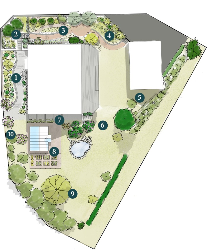 Här tänker vi att växtligheten både kommer skapa rum och insynsskydd för huset mot gatan.