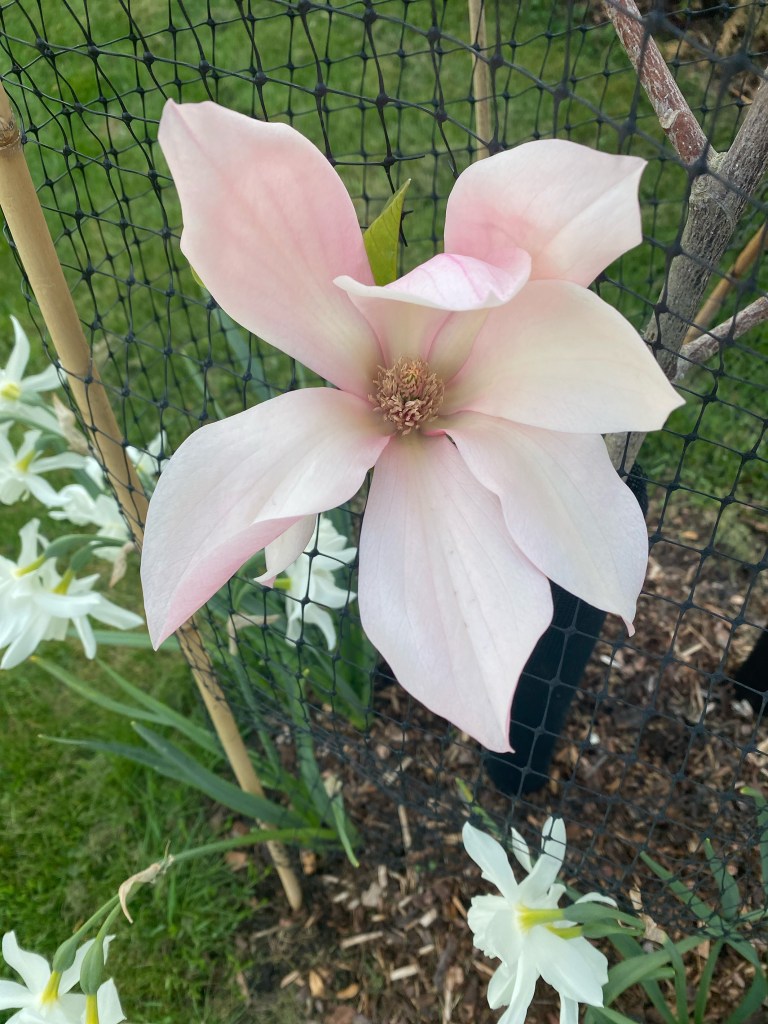 Vi har tagit ner ett prydnadsträd och ersatt med ett annat. Ett Epåletträd med långa klasar av doftande vita blommor under den tidiga sommaren.