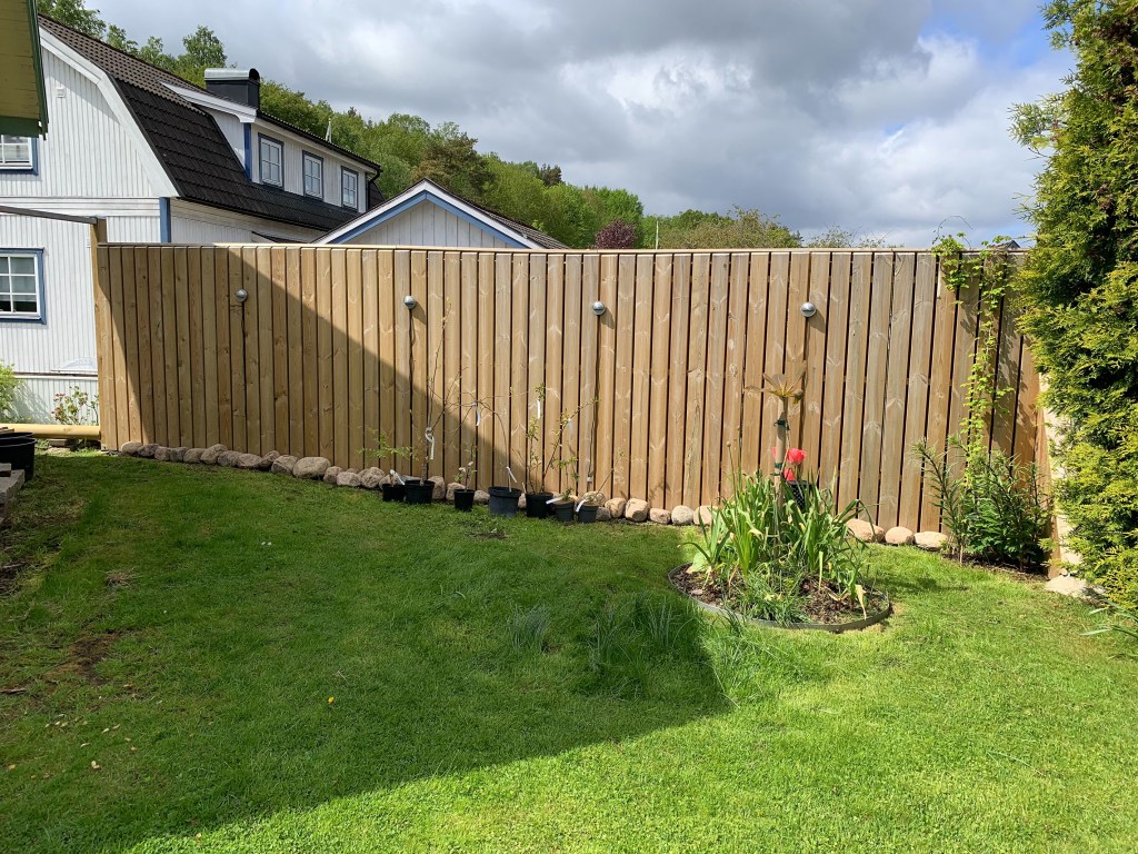 Tack vare det dåliga läget så startade vi vårt trädgårdsarbete här först. Vi byggde väggar. Det blev ett stående plank som vi behandlat så att det kommer att gråna med tiden. På planket har vi satt belysning och låtit en fembladsakebia växa och klättra.