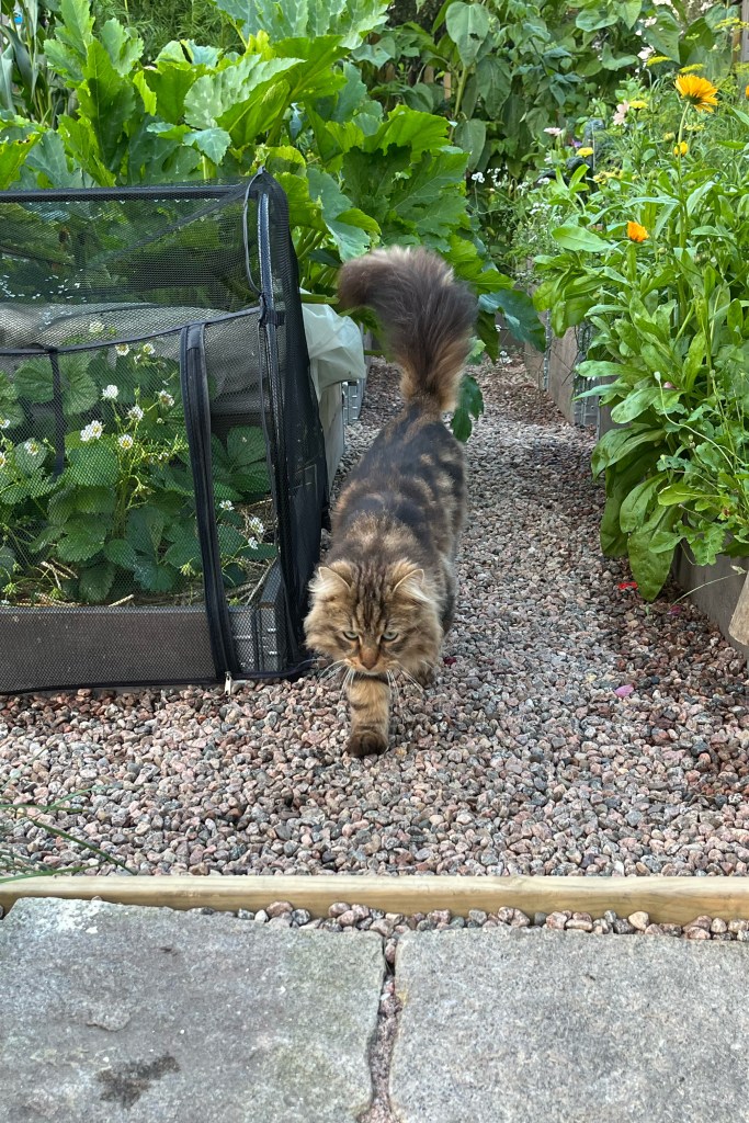 Ett av målen 2024 var att få till mer ätbart i vår trädgård. Och nu har den stora gräsmattan fått sällskap av en köksträdgård. Här har vi pallkragar blandat med grönsaker, örter, bärbuskar och vackra blommor som kan hjälpa till att hålla borta skadedjur.