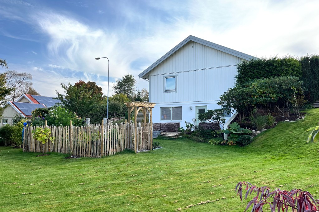 Det var viktigt att skapa bättre insynsskydd mot gatan framför huset. Ett liggande ribbstaket byggdes, träd och lummiga buskar som skapar avskärmning mot vägen planterades.